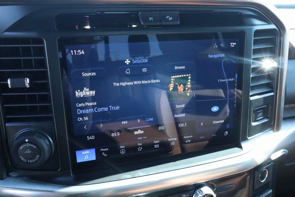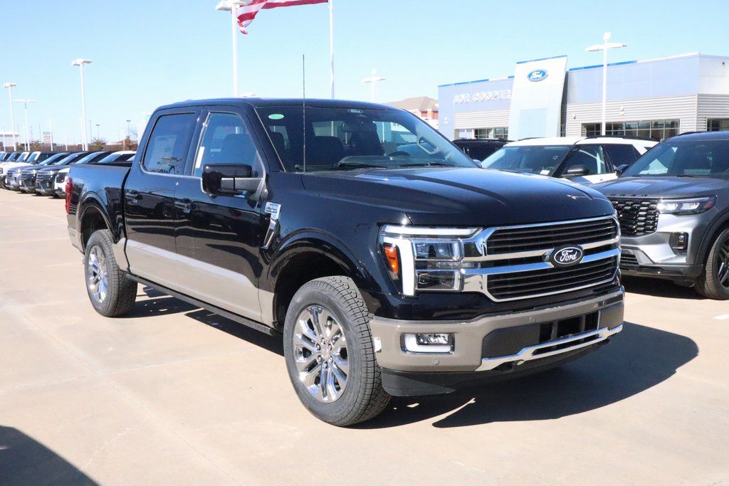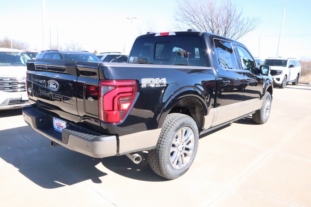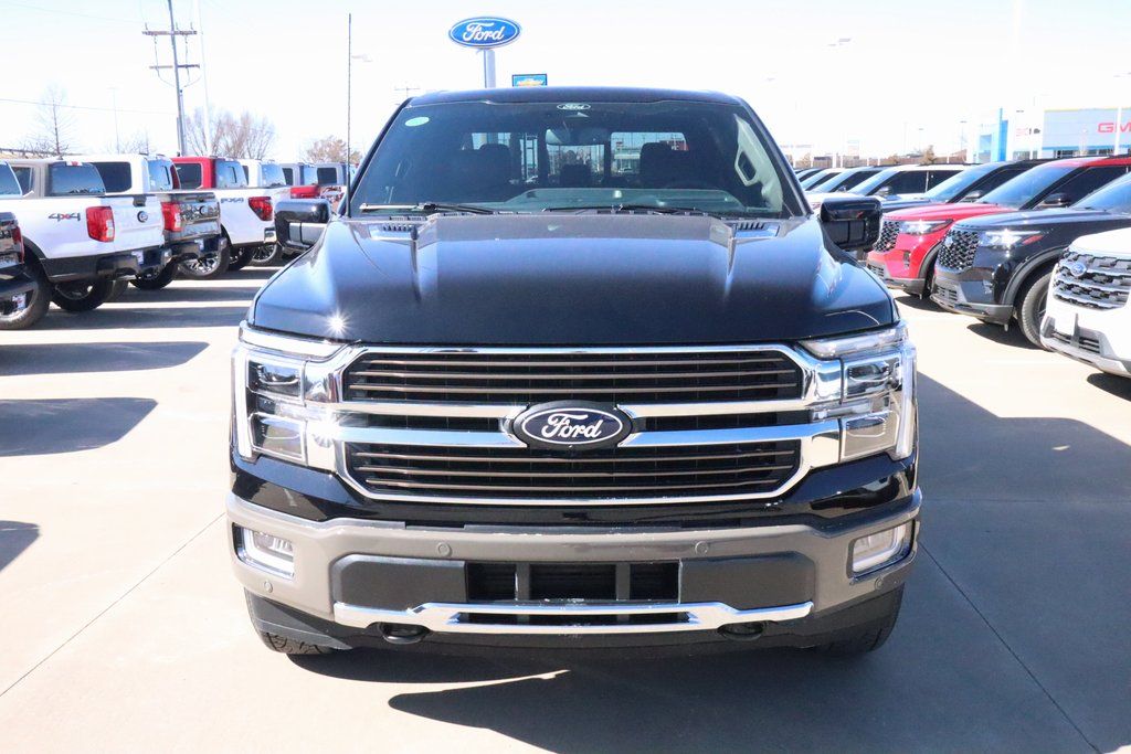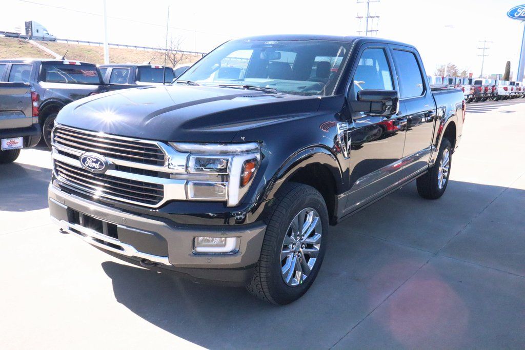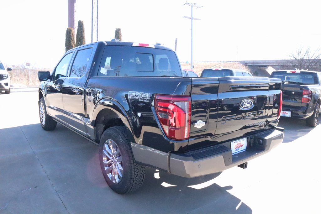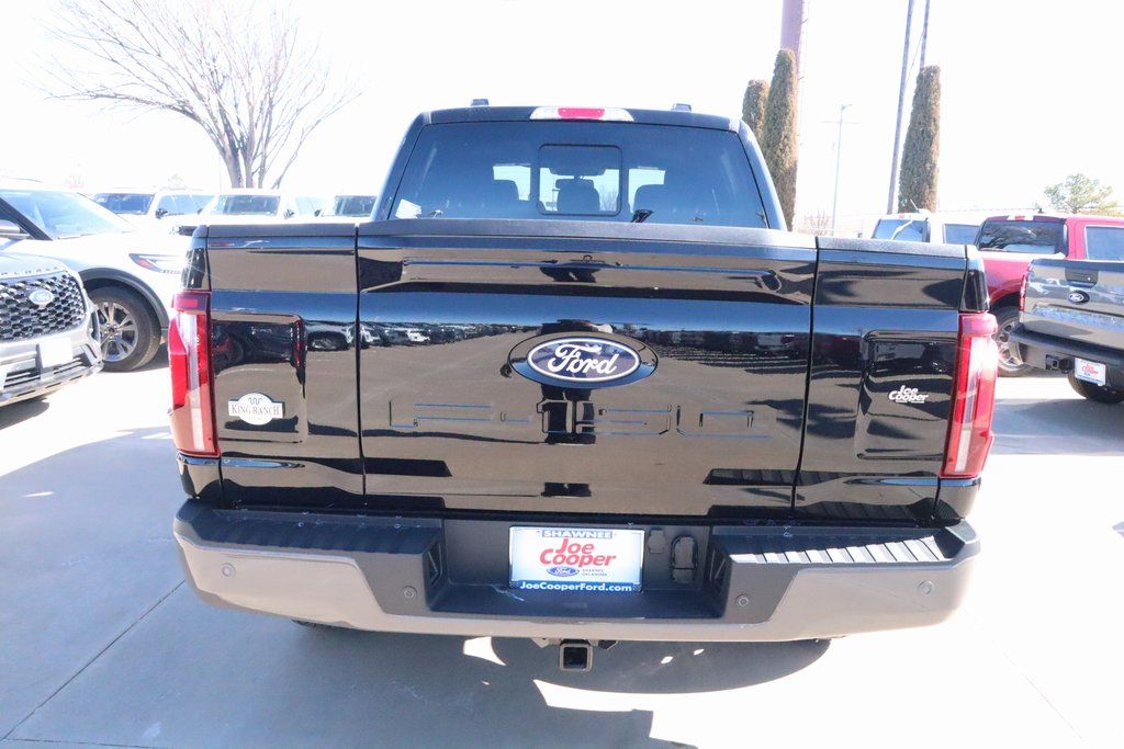 Joe Cooper Ford of Shawnee is delighted to offer this stout 2025 Ford F-150 King Ranch in Agate Black Metallic. Well equipped with Equipment Group 601A High, FX4 Off-Road Package, 4WD, 14 Speakers, 4-Wheel Disc Brakes, ABS brakes, Adjustable pedals, Air Conditioning, Alloy wheels, AM/FM radio: SiriusXM with 360L, Auto High-beam Headlights, Auto tilt-away steering wheel, Auto-dimming door mirrors, Auto-dimming Rear-View mirror, Automatic temperature control, Brake assist, Chrome wheels, Compass, Delay-off headlights, Driver door bin, Driver vanity mirror, Dual front impact airbags, Dual front side impact airbags, Electronic Stability Control, Emergency communication system: SYNC 4 911 Assist, Front anti-roll bar, Front Bucket Seats, Front Center Armrest, Front dual zone A/C, Front fog lights, Front reading lights, Front wheel independent suspension, Fully automatic headlights, Garage door transmitter, Genuine wood dashboard insert, Heads-Up Display, Heated door mirrors, Heated front seats, Heated rear seats, Heated steering wheel, Illuminated entry, Internet access capable: FordPass Connect 5G, King Ranch Multicontour Leather Bucket Seats, Leather steering wheel, Low tire pressure warning, Memory seat, Navigation system: Connected Navigation, Occupant sensing airbag, Outside temperature display, Overhead airbag, Overhead console, Panic alarm, Passenger door bin, Passenger vanity mirror, Pedal memory, Power door mirrors, Power driver seat, Power moonroof, Power passenger seat, Power steering, Power windows, Radio data system, Radio: B&O Unleashed Sound System by Bang & Olufsen, Rain sensing wipers, Rear reading lights, Rear seat center armrest, Rear step bumper, Rear window defroster, Remote keyless entry, Security system, Speed control, Split folding rear seat, Steering wheel memory, Steering wheel mounted audio controls, SYNC 4 w/Enhanced Voice Recognition, Tachometer, Telescoping steering wheel, Tilt steering wheel, Traction control, Trip computer, Turn signal indicator mirrors, Variably intermittent wipers, Ventilated front seats, Voltmeter, and Wheels: 20" Chrome-Like PVD.