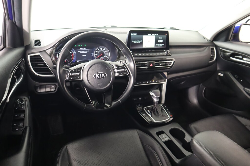 2021 Kia Seltos SX Sunroof Package (Sunroof), Cooper Certified Certified, Navigation System, Radio: AM/FM/MP3 Display Audio, Remote keyless entry, Smart Key w/ Push Button and Remote Start, 18" Alloy Wheels, 4-Wheel Disc Brakes, 4.643 Axle Ratio, 8 Speakers, ABS brakes, Air Conditioning, Alloy wheels, AM/FM radio: SiriusXM, Apple CarPlay & Android Auto, Auto-dimming Rear-View mirror, Automatic temperature control, Brake assist, Bumpers: body-color, Cargo Tray, Carpeted Floor Mats, Delay-off headlights, Driver door bin, Driver vanity mirror, Dual front impact airbags, Dual front side impact airbags, Electronic Stability Control, Emergency communication system, Exterior Parking Camera Rear, Four wheel independent suspension, Front anti-roll bar, Front Bucket Seats, Front Center Armrest, Front fog lights, Front reading lights, Fully automatic headlights, Heated door mirrors, Heated Front Bucket Seats, Heated front seats, Illuminated entry, Leather Seat Trim, Leather Shift Knob, Low tire pressure warning, Occupant sensing airbag, Outside temperature display, Overhead airbag, Overhead console, Panic alarm, Passenger door bin, Passenger vanity mirror, Power door mirrors, Power driver seat, Power steering, Power windows, Rear seat center armrest, Rear window defroster, Rear window wiper, Security system, Speed control, Speed-sensing steering, Split folding rear seat, Spoiler, Steering wheel mounted audio controls, Tachometer, Telescoping steering wheel, Tilt steering wheel, Traction control, Trip computer, Turn signal indicator mirrors, and Variably intermittent wipers.