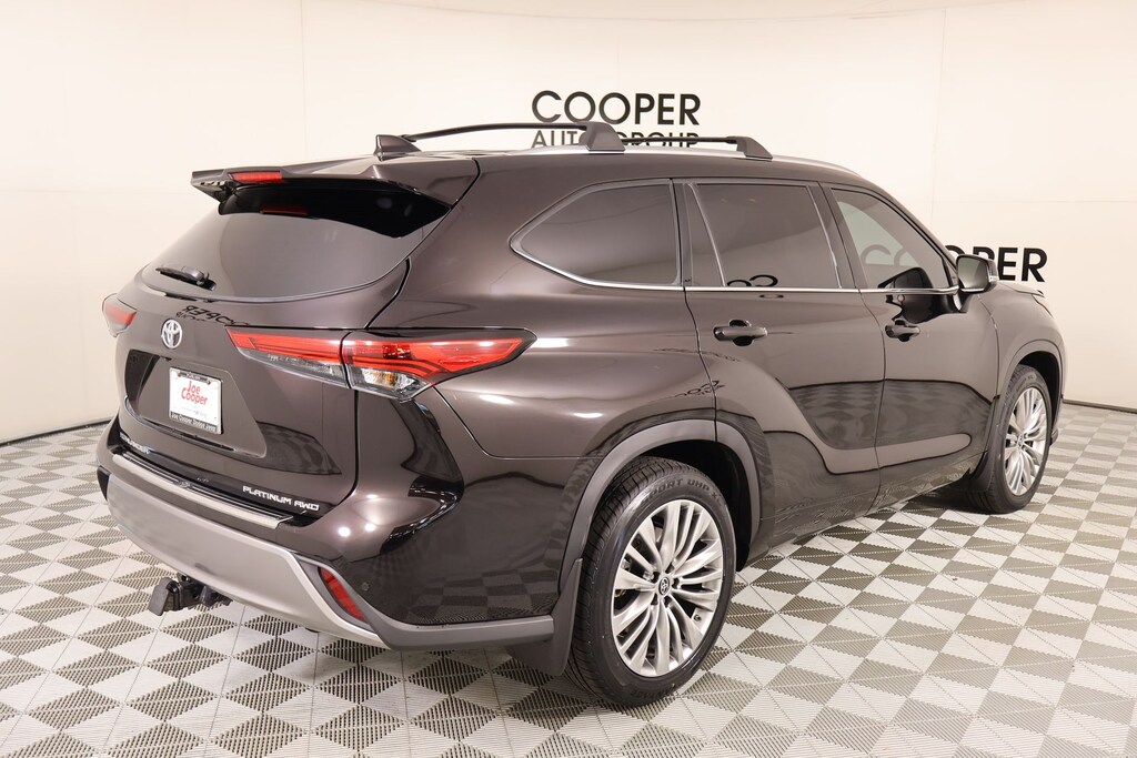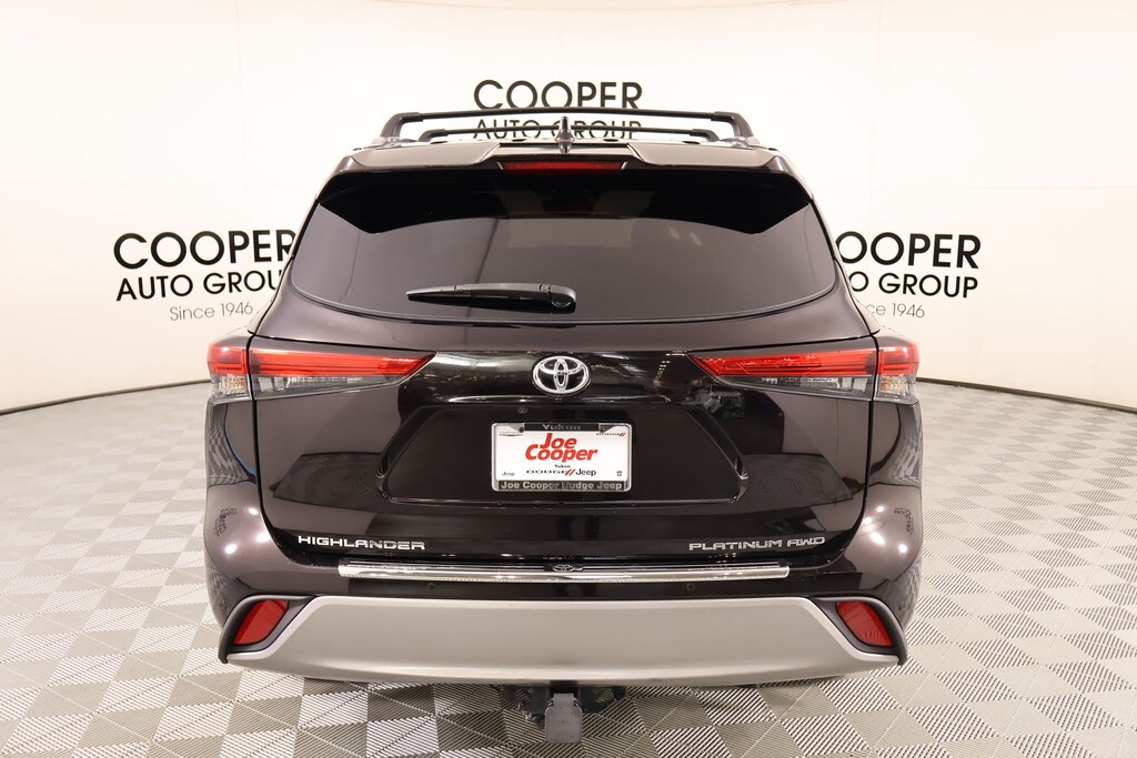 Joe Cooper Chrysler Dodge Jeep Ram of Yukon **405-265-1400** Black 2022 Toyota Highlander Platinum AWD 3.5L V6 DOHC THIS VEHICLE COMES EQUIPPED WITH THE FOLLOWING OPTIONS AND FEATURES: Cooper Certified Certified, AWD, 11 Speakers, 20" Painted Alloy Wheels, 4-Wheel Disc Brakes, ABS brakes, Air Conditioning, AM/FM radio: SiriusXM, Apple CarPlay/Android Auto, Auto High-beam Headlights, Auto-dimming Rear-View mirror, Automatic temperature control, Brake assist, Bumpers: body-color, Delay-off headlights, Digital Rearview Mirror w/HomeLink, Driver door bin, Driver vanity mirror, Electronic Stability Control, Four wheel independent suspension, Front anti-roll bar, Front dual zone A/C, Front fog lights, Front reading lights, Fully automatic headlights, Garage door transmitter: HomeLink, Heads-Up Display, Heated door mirrors, Heated front seats, Heated rear seats, Heated steering wheel, High Grade LED Projector Headlights, Illuminated entry, Knee airbag, Leather Shift Knob, Low tire pressure warning, Memory seat, Navigation system: Dynamic Navigation (3-year trial), Occupant sensing airbag, Panic alarm, Panoramic Moonroof, Passenger door bin, Power driver seat, Power Liftgate, Power moonroof, Power steering, Power windows, Radio: Premium Audio w/JBL Clari-Fi, Rain sensing wipers, Rear air conditioning, Rear anti-roll bar, Rear window defroster, Rear window wiper, Remote keyless entry, Security system, Speed-sensing steering, Steering wheel mounted audio controls, Telescoping steering wheel, Tilt steering wheel, Traction control, Variably intermittent wipers, Ventilated front seats, 3.003 Axle Ratio, 3rd row seats: split-bench, Alloy wheels, Dual front impact airbags, Dual front side impact airbags, Emergency communication system: Safety Connect with 1-year trial, Front Bucket Seats, Front Center Armrest, Heated/Ventilated Front Bucket Seats, Leather Seat Trim, Outside temperature display, Overhead airbag, Overhead console, Panoramic View Monitor, Passenger vanity mirror, Power door mirrors, Power passenger seat, Rear reading lights, Reclining 3rd row seat, Roof rack: rails only, Speed control, Split folding rear seat, Spoiler, Tachometer, Trip computer, and Turn signal indicator mirrors. Recent Arrival! Cooper Certified, NO ACCIDENT HISTORY ON CARFAX!!!!, NAVIGATION/GPS/NAV, REAR VIEW CAMERA, LEATHER, SUNROOF/MOONROOF, KEYLESS ENTRY, BLUETOOTH HANDS FREE, APPLE CARPLAY, AWD, 11 Speakers, 20" Painted Alloy Wheels, 4-Wheel Disc Brakes, ABS brakes, Air Conditioning, AM/FM radio: SiriusXM, Apple CarPlay/Android Auto, Auto High-beam Headlights, Auto-dimming Rear-View mirror, Automatic temperature control, Brake assist, Bumpers: body-color, Delay-off headlights, Digital Rearview Mirror w/HomeLink, Driver door bin, Driver vanity mirror, Electronic Stability Control, Four wheel independent suspension, Front anti-roll bar, Front dual zone A/C, Front fog lights, Front reading lights, Fully automatic headlights, Garage door transmitter: HomeLink, Heads-Up Display, Heated door mirrors, Heated front seats, Heated rear seats, Heated steering wheel, High Grade LED Projector Headlights, Illuminated entry, Knee airbag, Leather Shift Knob, Low tire pressure warning, Memory seat, Navigation system: Dynamic Navigation (3-year trial), Occupant sensing airbag, Panic alarm, Panoramic Moonroof, Passenger door bin, Power driver seat, Power Liftgate, Power moonroof, Power steering, Power windows, Radio: Premium Audio w/JBL Clari-Fi, Rain sensing wipers, Rear air conditioning, Rear anti-roll bar, Rear window defroster, Rear window wiper, Remote keyless entry, Security system, Speed-sensing steering, Steering wheel mounted audio controls, Telescoping steering wheel, Tilt steering wheel, Traction control, Variably intermittent wipers, Ventilated front seats.